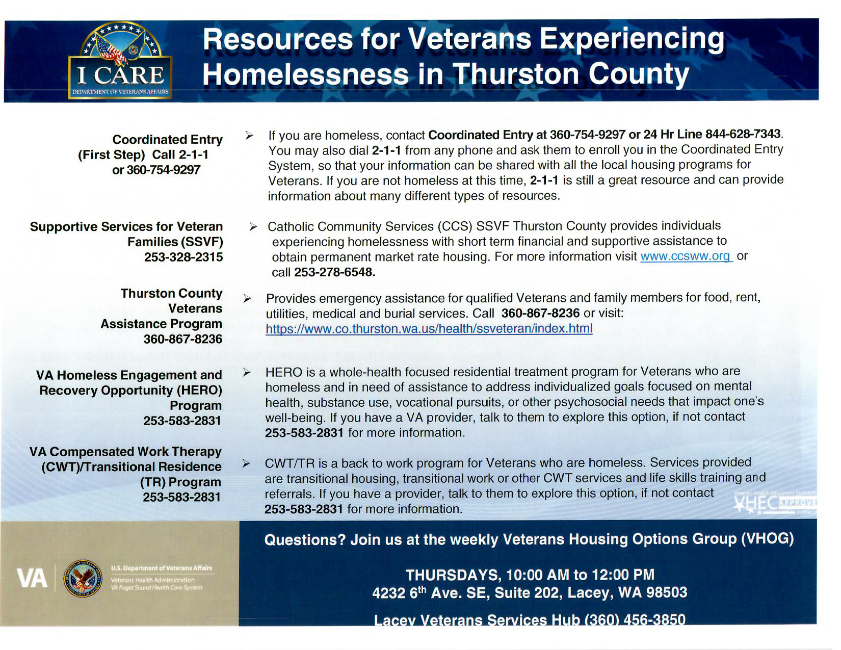 We work hard with our partners and veterans to assist them with housing. If you are a homeless Veteran or about to become homeless join us every Thursday (except holidays) at 10 a.m. for our Veterans Housing Option Group (VHOG) to learn about what programs are available to assist you. *Eligibility requirements differ